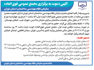 اطلاعیه دعوت به برگزاری مجمع عمومی فوقالعاده سازمان نظام مهندسی ساختمان استان تهران نظام مهندسیایرانپیشنهاد سردبیر خبرنگار محسن آقابابایی تاریخ انتشار مهر ۲۱, ۱۴۰۴ 0 به گزارش تاسیسات نیوز به نقل از اسازمان نظام مهندسی، مجمع عمومی فوق العاده نوبت اول بدین شرح است: 0 اشتراک