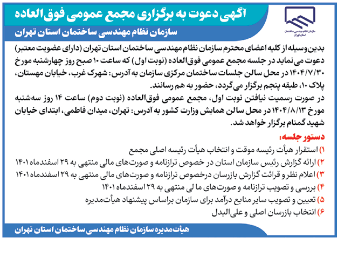 اطلاعیه دعوت به برگزاری مجمع عمومی فوقالعاده سازمان نظام مهندسی ساختمان استان تهران نظام مهندسیایرانپیشنهاد سردبیر خبرنگار محسن آقابابایی تاریخ انتشار مهر ۲۱, ۱۴۰۴ 0 به گزارش تاسیسات نیوز به نقل از اسازمان نظام مهندسی، مجمع عمومی فوق العاده نوبت اول بدین شرح است: 0 اشتراک