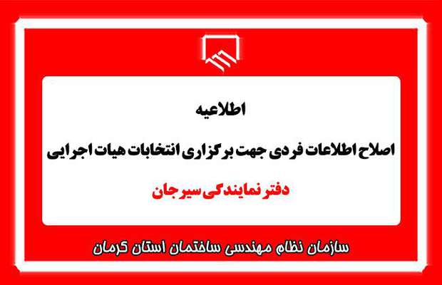 به اطلاع اعضای محترم دارای پروانه اشتغال به کار معتبر در دفتر نمایندگی سیرجان می رساند نظر به اینکه انتخابات هیات اجرایی دفتر نمایندگی به صورت الکترونیکی برگزار خواهد شد، برای رفع مغایرت احتمالی اطلاعات فردی و شماره تلفن همراه خود از روز شنبه مورخ ۱۴۰۱/۱۰/۰۳ لغایت روز چهارشنبه مورخ ۱۴۰۱/۱۰/۰۷ به صورت حضوری با همراه داشتن کارت شناسایی معتبر به واحد عضویت سازمان واقع در کرمان، ساختمان شماره ۲ مراجعه نمایند.
