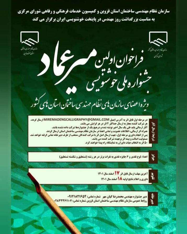 به گزارش تاسیسات نیوز، اعلام نتایج داوری جشنواره ملی خوشنویسی میرعماد (ویژه اعضای سازمانهای نظام مهندسی ساختمان استانهای کشور) اعلام شد. منتخبین مازندرانی که آثار آنها در مرحله اول توسط داوران برای شرکت در نمایشگاه انتخاب گردید: