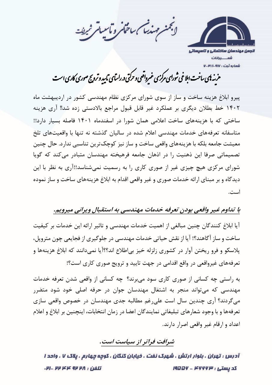 تاسیسات نیوز: انجمن مهندسان ساختمانی و تاسیساتی شمیرانات در خصوص ابلاغ هزینه ساخت غیرواقعی از سوی شورای مرکزی بیانیه ای به شرح ذیل منتشر کرد: