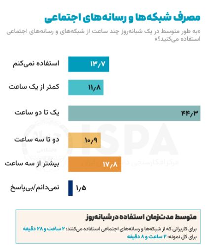 جهت بررسی مدت زمان استفاده مردم از شبکهها و رسانههای اجتماعی، در سوالی از آنها پرسیده شد: «به طور متوسط در یک شبانهروز چند ساعت از شبکهها و رسانههای اجتماعی استفاده میکنید؟». یافتهها نشان میدهد ۱۳٫۷ درصد افراد بالای ۱۵ سال کشور اصلا از شبکهها و رسانههای اجتماعی استفاده نمیکنند. ۴۴٫۳ درصد مردم، در شبانه روز یک تا دو ساعت از شبکهها و رسانههای اجتماعی استفاده میکنند. به طور متوسط افراد بالای ۱۵ سال کشور در یک شبانه روز، ۲ ساعت و ۸ دقیقه از شبکهها و رسانههای اجتماعی استفاده میکنند.