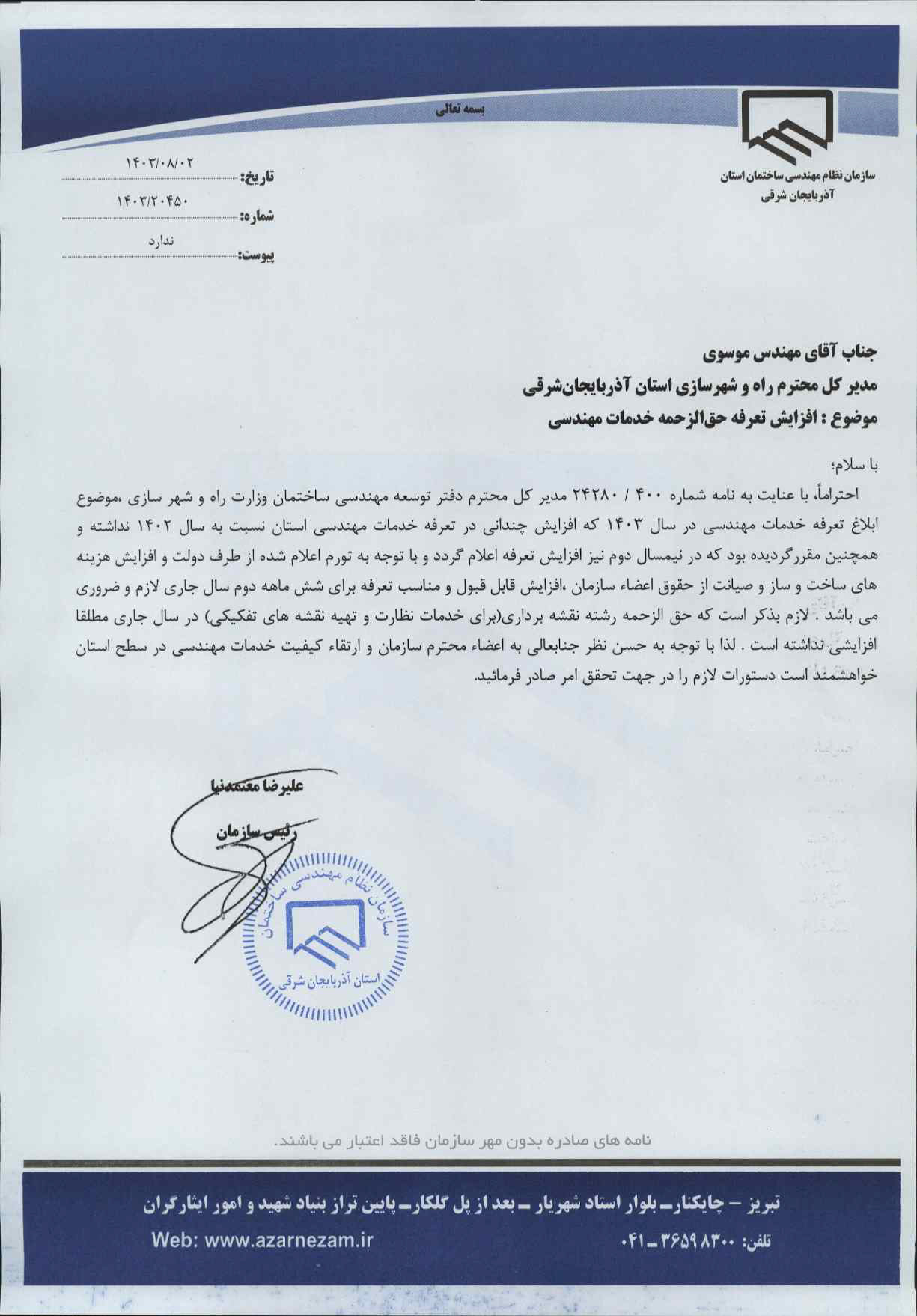 تعرفه حق الزحمه خدمات مهندسی افزایش پیدا کند نظام مهندسی خبرنگار صدیقه بهزادپور تاریخ انتشار آبان ۱۶, ۱۴۰۳ 0 به گزارش تاسیسات نیوز، دکتر علیرضا معتمدنیا رئیس سازمان نظام مهندسی ساختمان آذربایجان شرقی طی نامه ای از مهندس سید احمد موسوی مدیرکل راه و شهرسازی استان درخواست کرد تا نسبت به افزایش تعرفه حق الزحمه خدمات مهندسی اقدامات و دستورات لازم را صادر نماید. تعرفه خدمات نظام مهندسینظام مهندسی ساختماننظام مهندسی ساختمان آذربایجانشرقی 0 اشتراک