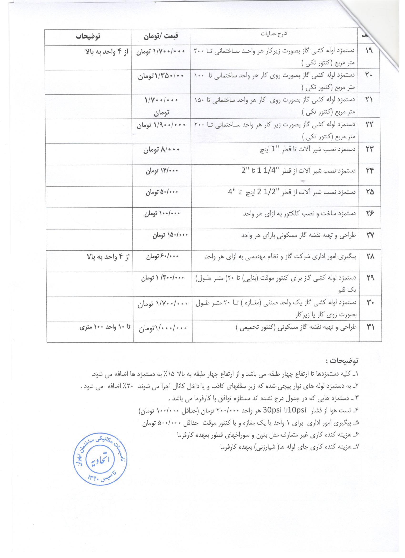 علاوه بر اینها، دستمزد نصب شیرآلات، طراحی و تهیه نقشه کار مسکونی هر واحد، لولهکشی گاز برای کنتور موقت، لولهکشی گاز برای واحد صنفی و … نیز از سوی اتحادیه تاسیسات مکانیکی ساختمان تهران اعلام شده است که مشروح آن با جزییات در جدولهای زیر آمده است.