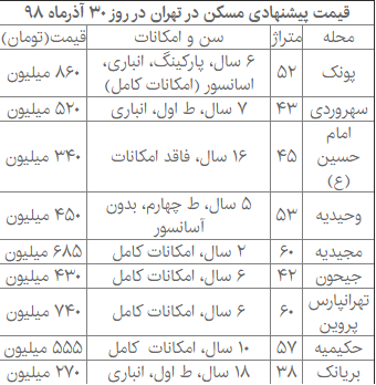 در شرایط فعلی، کارشناسان معتقدند که هر دو طرف عرضه و تقاضا در بازار مسکن به درک مشترک رسیدهاند. از یک طرف مالکان به این نتیجه رسیدهاند که ظرفیتی برای رشد قیمت وجود ندارد. خریداران نیز میدانند که نمیتوان انتظار ریزش شدید قیمت را داشت. آبان ماه ۱۳۹۸ با اینکه معدل کلی قیمت مسکن شهر تهران دو درصد نسبت به ماه قبل از آن کاهش داشته اما جزئیات گویای آن است که قیمت در ۱۵ منطقه نیمه جنوبی و پرتقاضای شرق و غرب، رشد یافت اما با توجه به افت نسبتاً زیاد قیمتها در مناطق ۱، ۲، ۳، ۶، ۸، ۱۱ و ۲۰ میانگین کل دو درصد کاهش نشان داد.