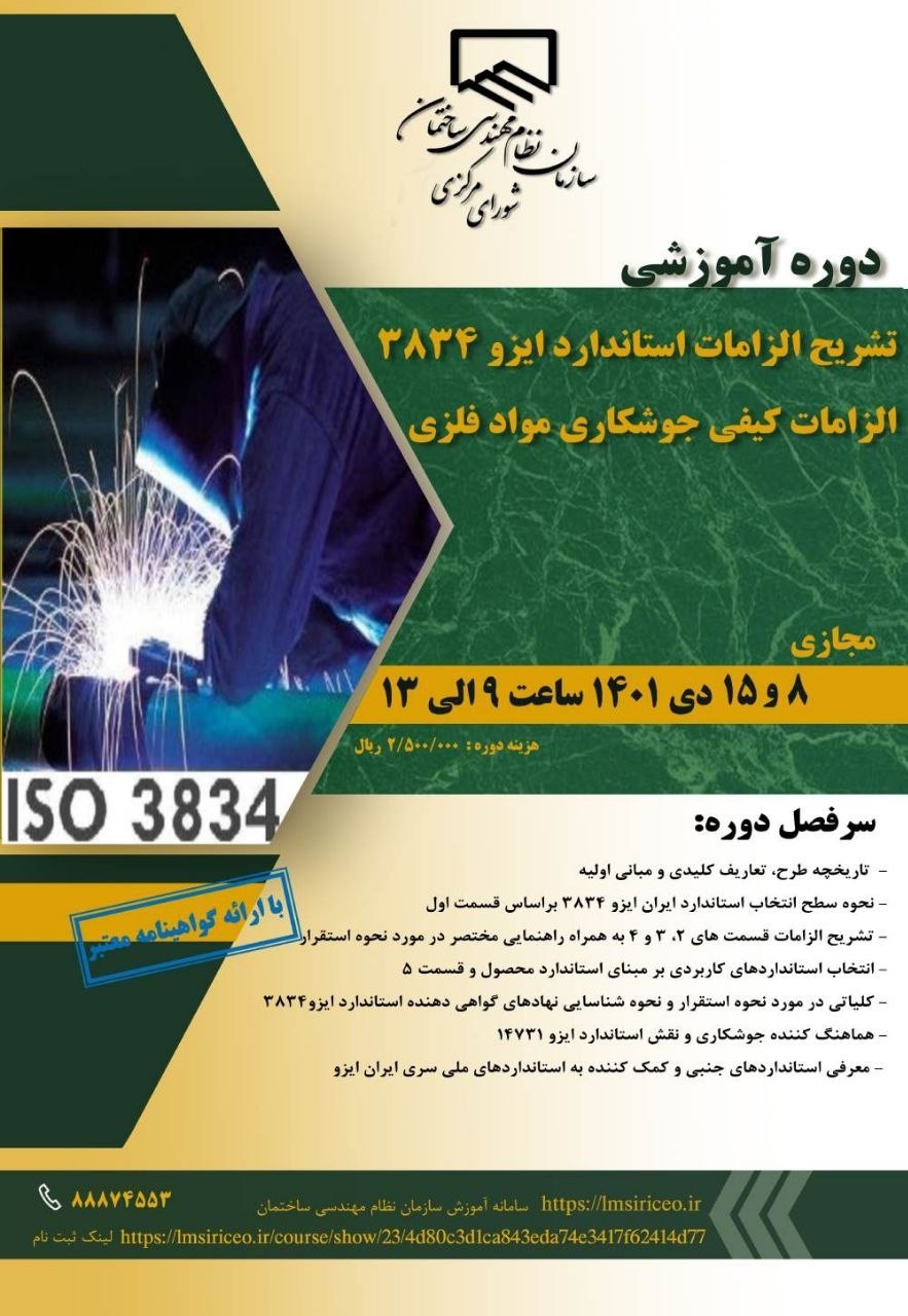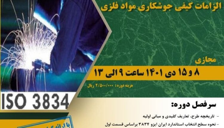دوره آموزشی تشریح الزامات استاندارد ایزو ۳۸۳۴-الزمات کیفی جوشکاری نظام مهندسیاستاندارد خبرنگار صدیقه بهزادپور تاریخ انتشار آذر ۲۳, ۱۴۰۱ 0 به گزارش تاسیسات نیوز، رئیس سازمان نظام مهندسی ساختمان طی نامهای دوره آموزشی با عنوان « تشریح الزامات استاندارد ایزو ۳۸۳۴-الزامات کیفی جوشکاری» را در روز پنجشنبه ۸ و ۱۵ دیماه ۱۴۰۱ ساعت ۱۳-۹ را اعلام کرد. الزامات استانداردایزودوره آموزشی استاندارد 0 اشتراک