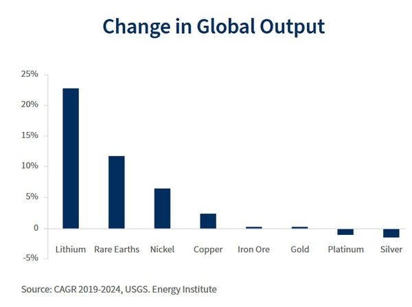 عناصر نادر خاکی رشد بیش از ۱۱ درصدی در تولید عناصر نادر خاکی، نتیجه‌ی تقاضای بالا در صنایع موتورهای الکتریکی، توربین‌های بادی، تجهیزات مخابراتی و صنایع دفاعی است. چین همچنان بازیگر مسلط این بازار است اما آمریکا، استرالیا و اتحادیه اروپا تلاش دارند زنجیره‌ی تامین خود را متنوع کنند تا وابستگی ژئوپلیتیکی کاهش یابد.نیکل؛ فلزی برای آینده‌ی باتری‌هاافزایش حدود ۶ تا ۷ درصدی تولید نیکل ناشی از گسترش استفاده از ترکیبات نیکل در باتری‌های با ظرفیت بالا است. اندونزی، با سیاست‌های سختگیرانه صادرات سنگ خام و جذب سرمایه در صنایع پایین‌دستی، به‌سرعت به یکی از قطب‌های اصلی تولید جهانی نیکل تبدیل شده است.