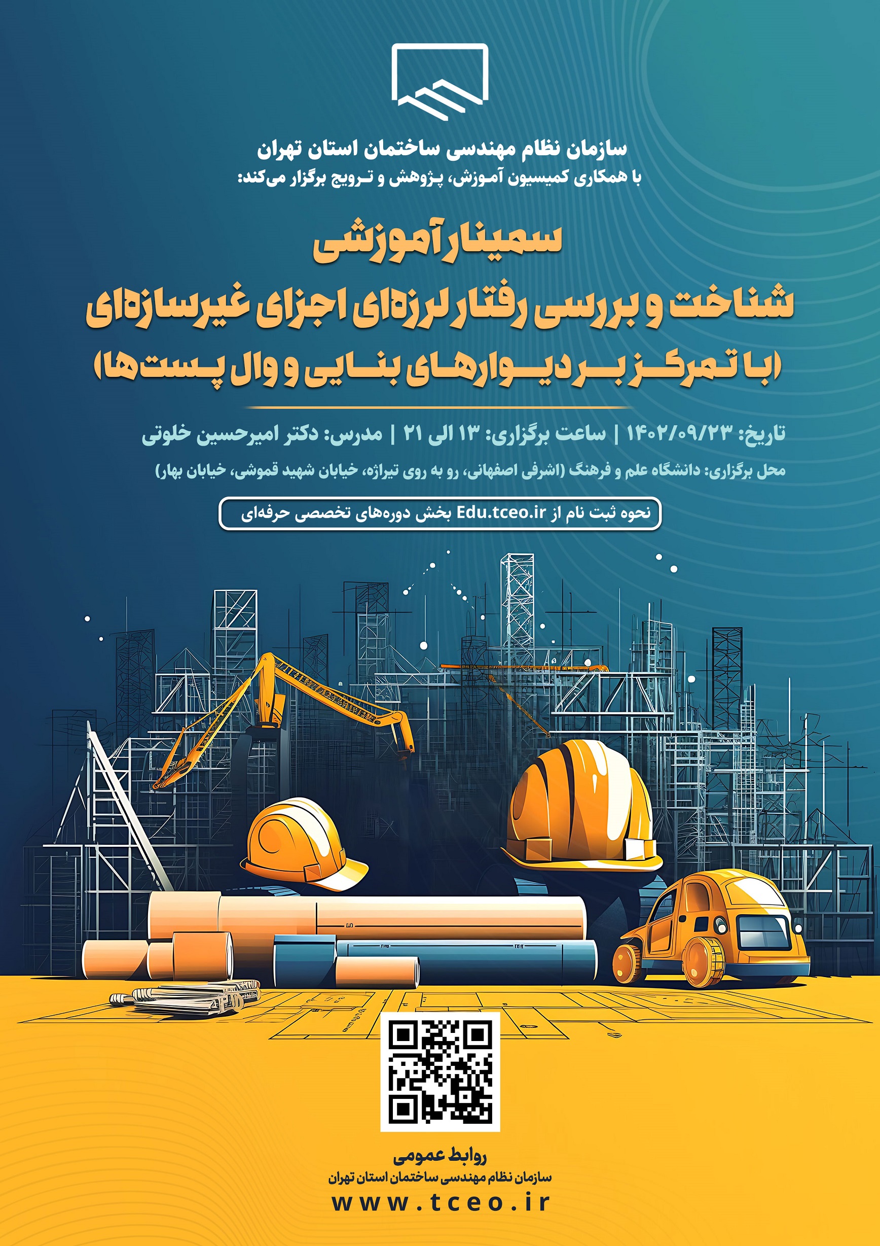 سازمان نظاممهندسی ساختمان استان تهران با همکاری کمیسیون آموزش، پژوهش و ترویج “سمینار آموزشی شناخت و بررسی رفتار لرزهای اجزای غیر سازهای ( با تمرکز بر دیوارهای بنایی و وال پستها ) را برگزار میکند:
