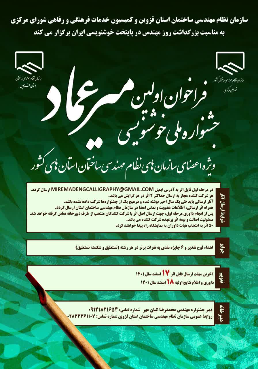 فراخوان اولین جشنواره ملی خوشنویسی میرعماد نظام مهندسی خبرنگار صدیقه بهزادپور تاریخ انتشار اسفند ۱۵, ۱۴۰۱ 0 به گزارش تاسیسات نیوز، سازمان نظام مهندسی ساختمان استان مازندران جهت شرکت در اولین جشنواره ملی خوشنویسی میرعماد فراخوان داد. جشنوار خوشنویسی میرعماد 0 اشتراک