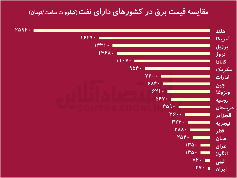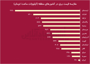 برای مثال، در ارمنستان، بهای هر کیلووات ساعت برق به ۹۹۰۰ تومان، معادل ۲۷۰ برابر ایران میرسد، در حالی که این کشور نیز منابع انرژی محدودی دارد و بخش زیادی از برق مصرفی خود را وارد میکند. در امارات متحده عربی قیمت برق خانگی ۷۲۰۰ تومان است، یعنی بیش از ۲۶ برابر نرخ فعلی برق در ایران. این کشور با وجود منابع عظیم گاز طبیعی و درآمد نفتی بالا، برق را ارزان به مردم نمیدهد. ترکیه نیز که کشوری با جمعیتی مشابه ایران و اقلیم نسبتاً همسان است، برق را با نرخ ۶۰۳۰ تومان عرضه میکند؛ رقمی که بیش از ۲۲ برابر تعرفه برق در ایران است.