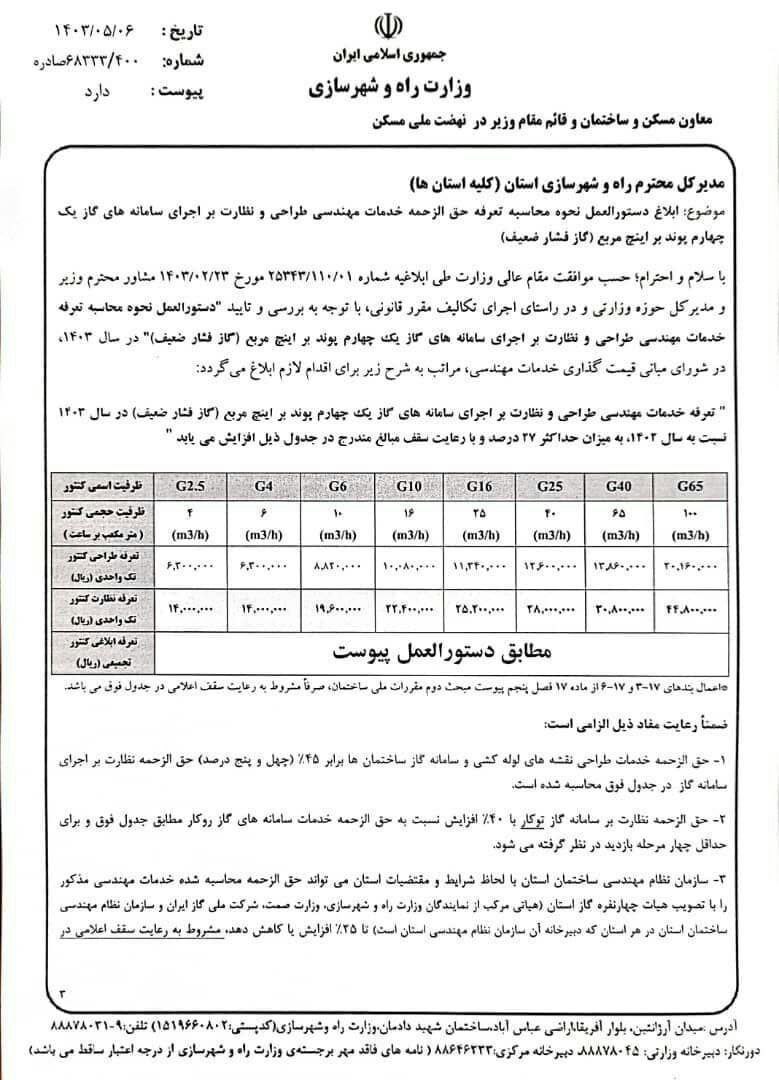 اکنون با گذشت حدود ۵ ماه از آغاز سال ۱۴۰۳، نرخ تعرفه نظارت و بازرسی از سوی وزارت راه و شهرسازی ابلاغ شده است. بنابر بررسی های انجام شده، تعرفه نظارت و بازرسی گاز در سال ۱۰۴۳ تفاوت چندانی با سال گذشته نداشته است.