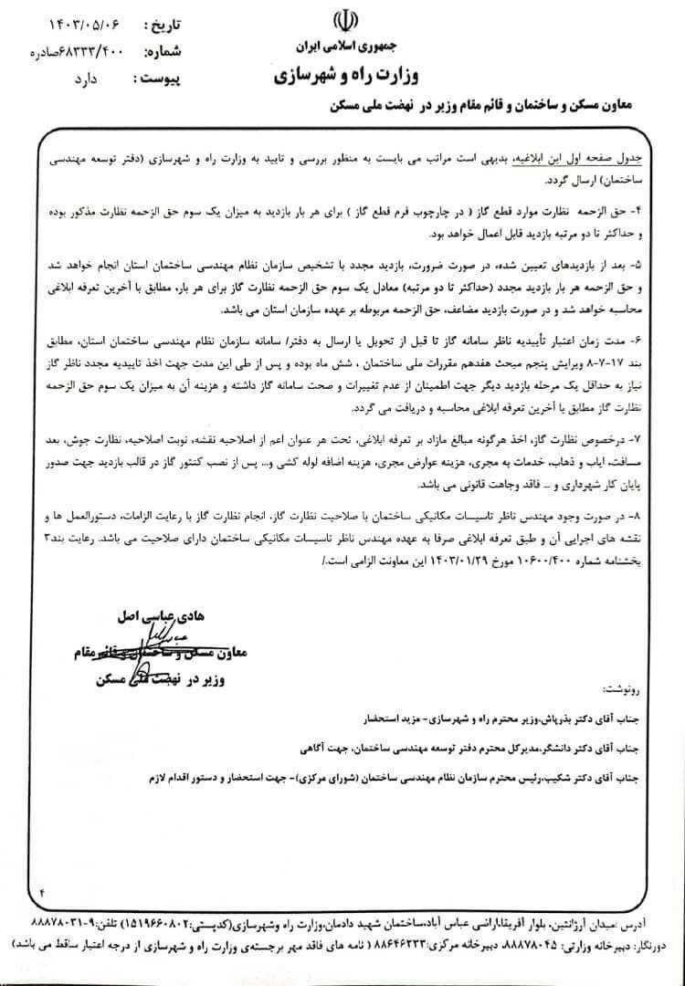 وی ادامه داد: « اما با تغییر وزیر در وزارت راه و شهرسازی موضوع مورد بحث همچنان بلاتکلیف ماند. پس از نزدیک به ۳ سال بار دیگر موضوع نرخ تعرفه نظارت گاز به جریان افتاد و برخی پارامترهای دیگر به آن اضافه شد. از جمله این پارامترها موضوع شاخص هزینه خانوارها در استان های مختلف بود که به رغم مخالفت من، حذف شد. یکی از پارامترهای مد نظر ما که نادیده انگاشته شد، هزینه ایاب و ذهاب مهندس ناظر بود که در استان ها با توجه به پراکندگی جمعیت، متغیر است. حذف مواردی از این دست موجب شد تا تعرفه به صورت یکسان برای تمام استان ها در نظر گرفته شود».