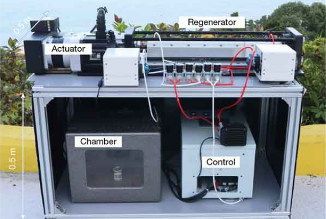 این دستگاه در مقیاس رومیزی و با فرکانس کاری ۱ هرتز، دمای منبع سرد ۱۲درجه سانتی‌گراد را از یک منبع دفع حرارت با دمای اتاق (۲۴ درجه سانتی‌گراد)  به دست آورد و بدین ترتیب افزایش اختلاف دما (temperature lift) معادل ۳۶ درجه سانتی‌گراد را ثبت کرد.