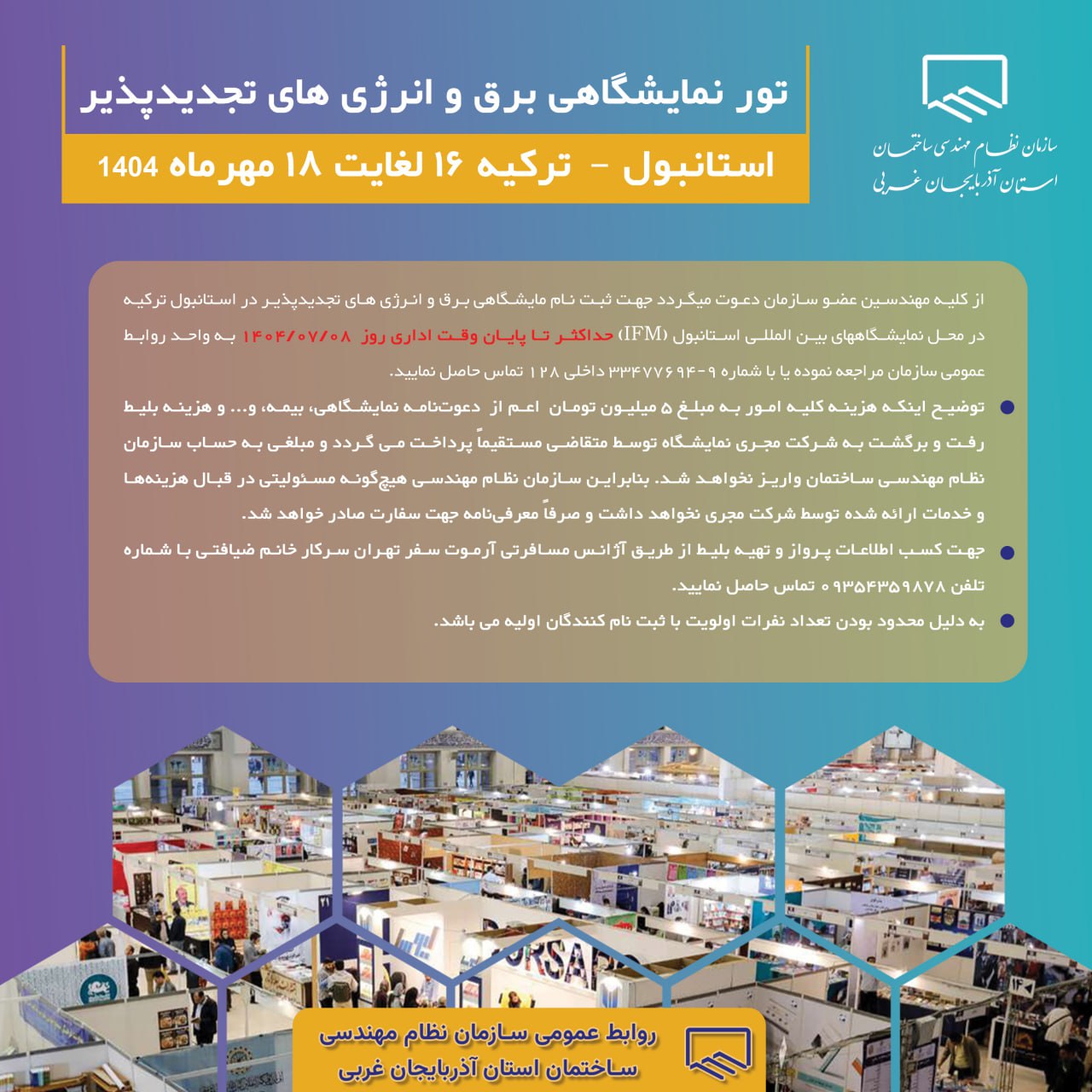 به گزارش تاسیسات نیوز، سازمان نظام مهندسی استان آذربایجان غربی قرار است تور نمایشگاهی برگزار کند در کنگره و رویداد جهانی انرژی!