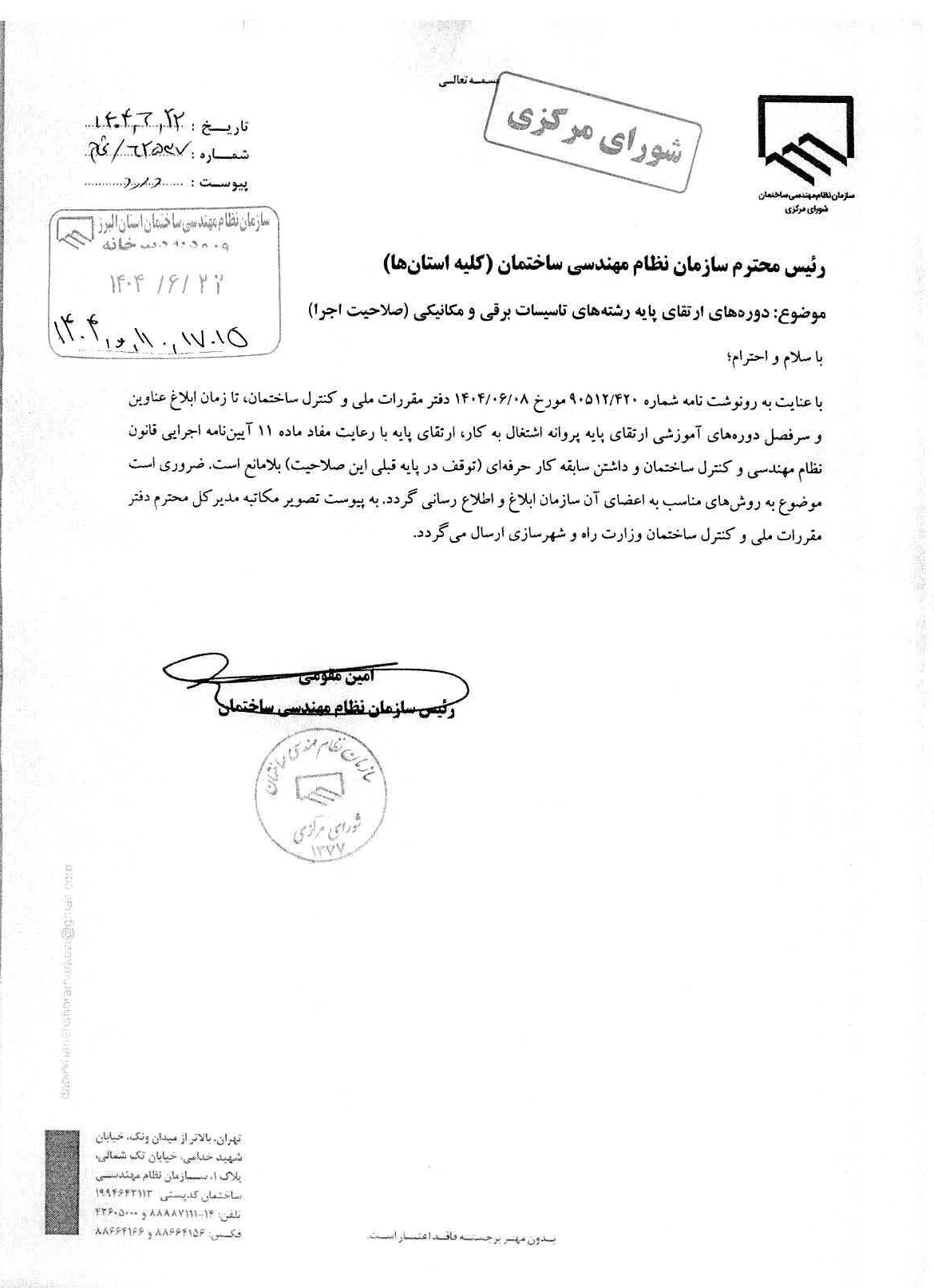 به گزارش تاسیسات نیوز به نقل از شورای مرکزی نظام مهندسی ساختمان، ابلاغیه این شورا در خصوص دوره های ارتقا پایه تاسیسات برقی و مکانیک( صلاحیت اجرا ) به این شرح است: