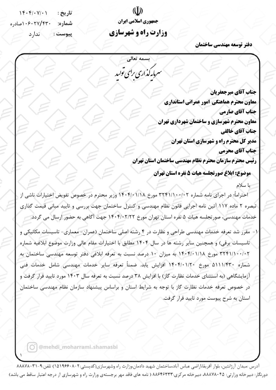 به اطلاع اعضای محترم سازمان نظام مهندسی ساختمان استان تهران میرساند در اجرای نامه شماره ۳۲۴۱/۱۰۰/۰۲ مورخ ۱۴۰۴/۰۱/۱۸ وزیر محترم راه و شهرسازی و بر اساس مصوبه جلسه مورخ ۱۴۰۴/۰۲/۲۲ هیئت ۵ نفره استان تهران، تعرفه خدمات مهندسی سال ۱۴۰۴ به شرح زیر ابلاغ شد: