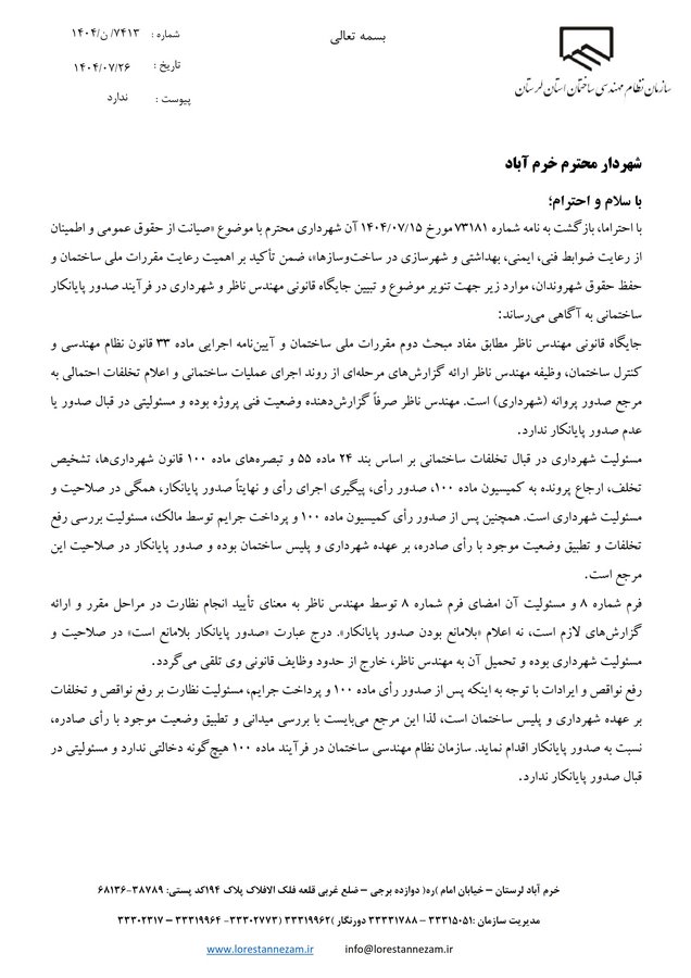 به گزارش تاسیسات نیوز از سازمان نظام مهندسی لرستان، این سازمان در پاسخ به نامه شهرداری خرم آباد اعلام کرد که وظیفه مهندس ناظر صرفاً ارائه گزارشهای فنی است و مسئولیتی در قبال صدور پایانکار ندارد. درج عبارت «صدور پایانکار بلامانع است» در فرم شماره ۸، خارج از حدود وظایف قانونی ناظرین است.