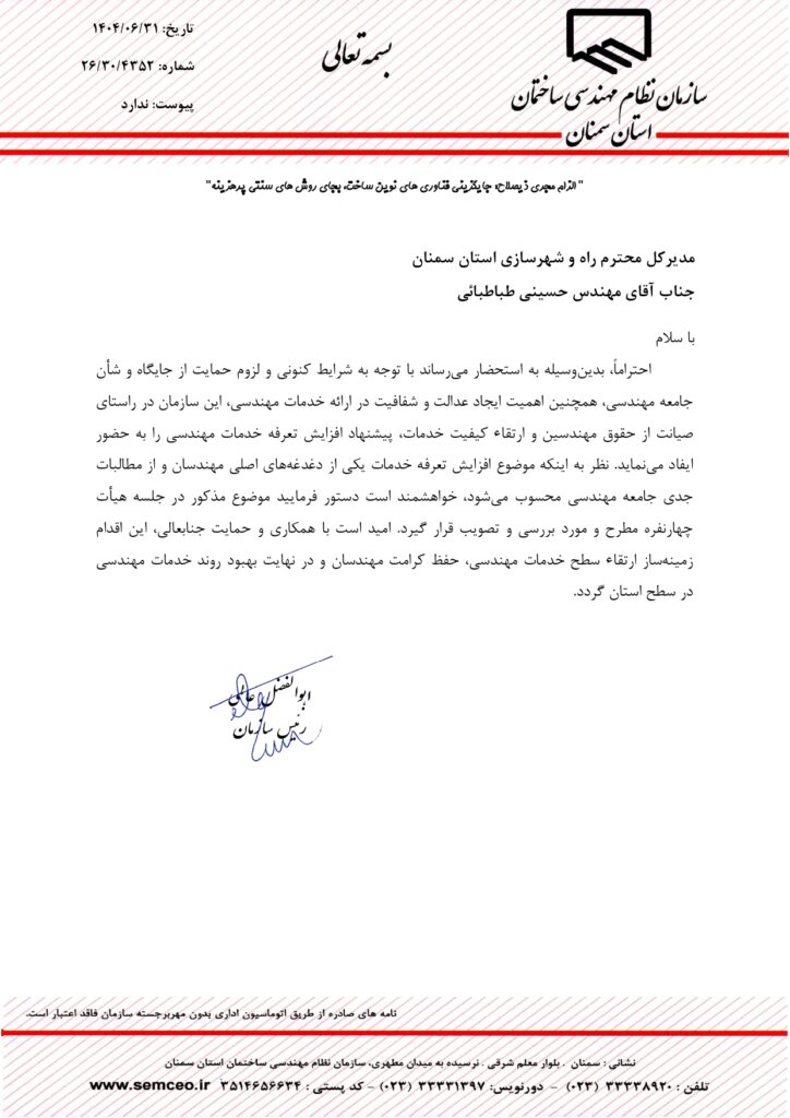 به گزارش تاسیسات نیوز به نقل از نظام مهندسی سمنان، رئیس سازمان طی نامه ای به مدیرکل راه و شهرسازی استان درخواست افزایش تعرفه نظام مهندسی را کرده است. متن نامه