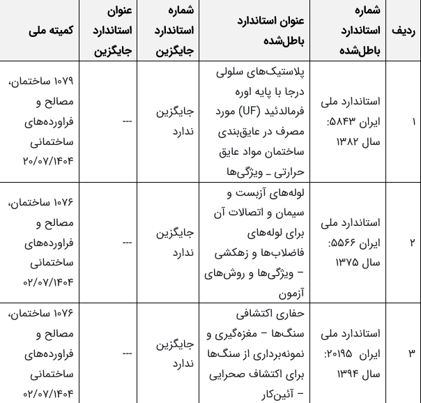 این استانداردها در اجلاسیه های ۱۰۷۶ و ۱۰۷۹ کمیته ملی ساختمان، مصالح و فراوردههای ساختمانی مورخه ۱۴۰۴/۰۷/۰۲و ۱۴۰۴/۰۷/۲۰، ۳استاندارد ملی زیر ابطلال و جایگزین آنها اعلام خواهد شد.