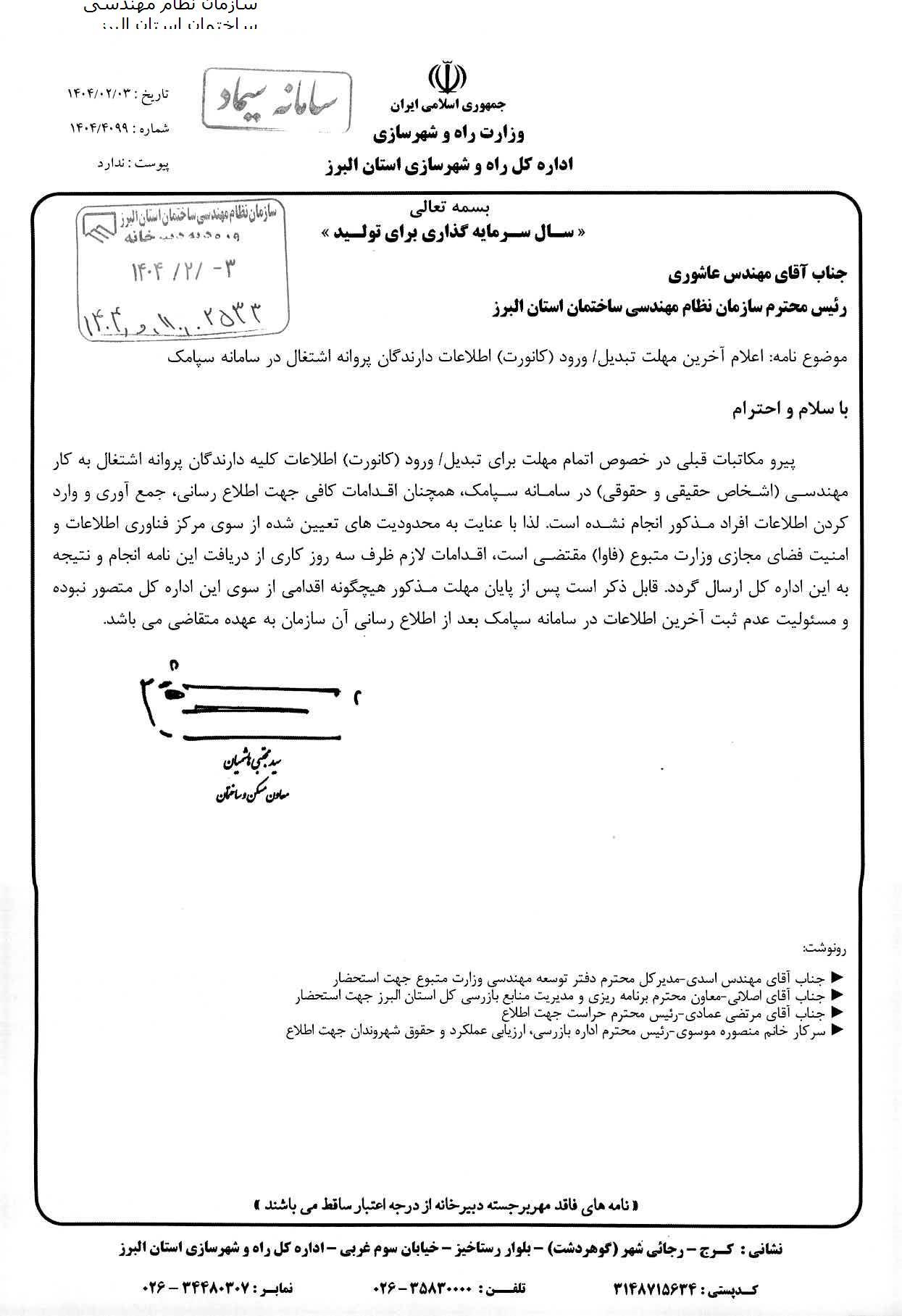 پیرو اطلاعیه های پیشین و به دنبال اعلام آخرین مهلت از سوی اداره کل راه و شهرسازی استان البرز، تمامی اعضای حقیقی و حقوقی دارای پروانه اشتغال فقط تا پایان ساعت اداری روز یکشنبه ۷ اردیبهشت ماه ۱۴۰۴ فرصت دارند تا به مراجعه به سامانه سپامک اطلاعات خود را به روز رسانی نمایند.